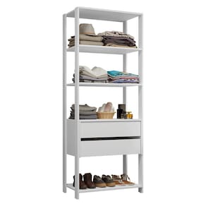 O Closet conta com duas gavetas e quatro prateleiras amplas, ideais para roupas dobradas, cais organizadoras, sapatos e itens pessoais Além disso, o móvel conta com acabamento branco de alta resistência, pés com sapatas plásticas que protegem contra a umidade, gavetas que permitem abertura total e ferragens incluídas para a fição na parede, garantindo mais estabilidade e segurança.