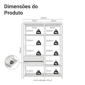 - Um Closet aberto de 70 cm com duas gavetas e quatro prateleiras