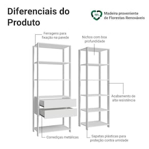 Além disso, o móvel conta com acabamento branco de alta resistência, pés com sapatas plásticas que protegem contra a umidade e ferragens incluídas para a fição na parede, garantindo mais estabilidade e segurança.
