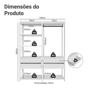 Seu design aberto facilita o acesso às roupas e acessórios no dia a dia. São quatro gavetas com corrediças que permitem abertura total, um cabideiro metálico e cinco prateleiras amplas para manter tudo no lugar, com visibilidade e funcionalidade.