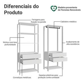 Seu design aberto facilita o acesso às roupas e acessórios no dia a dia. São quatro gavetas com corrediças que permitem abertura total, um cabideiro metálico e cinco prateleiras amplas para manter tudo no lugar, com visibilidade e funcionalidade.