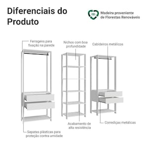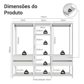 Um dos módulos conta com cinco prateleiras amplas, enquanto os outros dois módulos de 70 cm de largura oferecem duas gavetas espaçosas, um cabideiro e uma prateira em cada, garantindo um espaço de armazenamento eficiente e organizado.