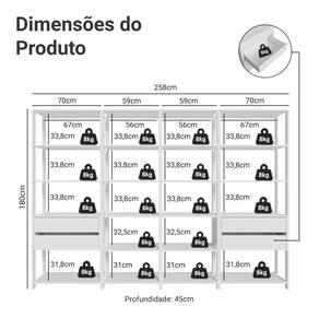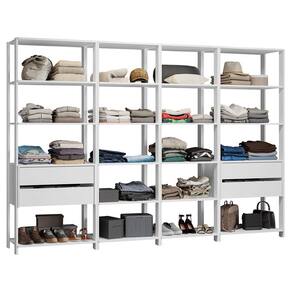 Cada módulo foi projetado para proporcionar um espaço de armazenamento organizado, unindo praticidade e estilo para seu ambiente. Você vai receber dois closets abertos de 59 cm de largura, cada um com cinco prateleiras amplas, perfeitos para roupas dobradas e calçados. E dois closets abertos de 70 cm de largura, cada um com duas gavetas espaçosas, ideais para itens menores e acessórios, além de quatro prateleiras.