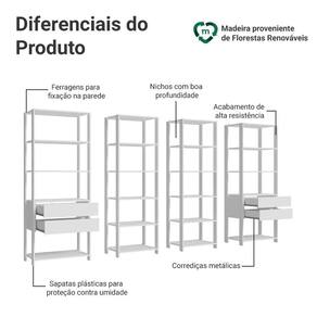 Além disso, o móvel conta com acabamento branco de alta resistência, pés com sapatas plásticas que protegem contra a umidade e ferragens incluídas para a fição na parede, garantindo mais estabilidade e segurança.