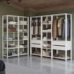 Cada módulo foi projetado para proporcionar um espaço de armazenamento organizado, unindo praticidade e estilo para seu ambiente. Você vai receber três closets abertos de 59 cm de largura, cada um com cinco prateleiras amplas, perfeitos para roupas dobradas e calçados. E dois closets abertos de 70 cm de largura, cada um com duas gavetas espaçosas, ideais para itens menores e acessórios, além dos cabideiros.