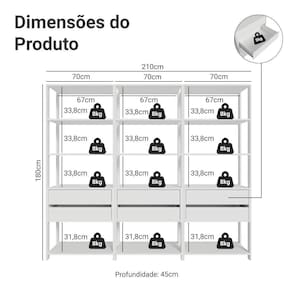 Cada módulo possui duas gavetas espaçosas e quatro prateleiras amplas, garantindo um espaço de armazenamento eficiente e organizado.