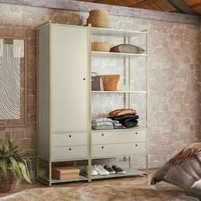 Este é o Conjunto de Closet Ind. Olivar-Módulos 04 e 01, produto que mostra uma diversidade de materiais, com metal nas laterais, MDF e MDP de 15 mm. Ele possui prateleiras para acomodar objetos ou roupas, cabideiro de alumínio, gavetas e portas com corrediças e dobradiças metálicas, tudo com design de uma pegada industrial para quem gosta do estilo mais urbano e contemporâneo onde você personaliza seu ambiente deixando-o exclusivo. Acabamento da Prateleira: Pintura UV Escala de Brilho da Prateleira: Semi-Brilho Possui Cabideiros: 01 Acabamento da Gaveta: Pintura UV Escala de Brilho da Gaveta: Semi-Brilho Material do Puxador da Gaveta: MDF Possui Organizador de Gaveta: Não Acabamento da Porta: Pintura UV Escala de Brilho da Porta: Semi-Brilho Material do Puxador da Porta: MDF Ambiente Principal: Quarto Complexidade da Montagem: Baixa: pode ser montado por uma pessoa sozinha Cor: Off White Cor do Produto: Off White Cor Interna: Off White Escala de Brilho: Semi-Brilho Gaveta com Chave: Não Guarda-Roupa Suporta Até (kg): 55 Itens Inclusos: 2 Módulos Closet, Kit Ferragens e Manual de Montagem Linha ou Coleção: Linha Manual de Montagem e Instalação: https://cdn2.madeiramadeira.com.br/atributo/olivar-moveis/1273313-manual-closet-ind-olivar-conj-04-01.pdf Material da Gaveta: MDF/MDP Material da Porta: MDF Material da Prateleira: MDP Material dos Pés: Plástico Material Principal: MDF/MDP Necessita Montagem: Sim Origem do Produto: Nacional Peso: 90,5 kg Peso Máximo por Gaveta: 2 Peso Máximo por Prateleira: 5 Possui Calceiros: Não Possui Espaço para Vestidos Longos: Sim Possui Espelho: Não Possui Espelho Interno: Não Possui Ganchos: Não Possui iluminação: Não Possui Painel de TV: Não Possui Pés: Não Possui Portas: 01 Possui Prateleiras: 05 Possui Sapateira: Sim Recomendações de Uso, Manutenção e Limpeza: Pano úmido. Não aplicar lustra móveis. Sapatas Niveladoras: Sim Sistema de Montagem: Parafusos e Minifix. Tipo de Corrediça da Gaveta: Metálica Simples Tipo de Dobradiça/Corrediça da Porta: Metálica Tipo de Gaveta: Externa Tipo de Guarda-Roupa: Closet Tipo de Puxador da Gaveta: Embutido Tipo de Puxador da Porta: Embutido