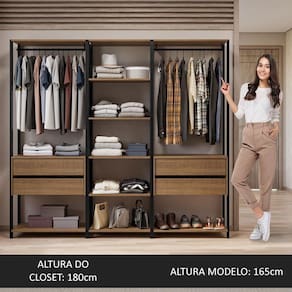 Com uma estrutura aberta, oferece fácil acesso aos seus pertences no dia a dia. Nesta versão, é composto por três peças independentes, proporcionando com um cabideiros metálicos, diversas prateleiras e quatro gavetas espaçosas, proporcionando um amplo espaço de armazenamento.