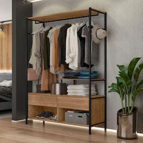 O Roupeiro Barcelona solteiro tipo closet é a escolha ideal para quem busca um ambiente moderno, arejado e organizado. Com design aberto e estrutura em tubular com pintura epóxi preta semi fosca, ele combina resistência e sofisticação.