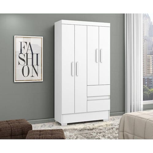 Guarda Roupa de 04 portas e 02 gavetas. Produzido em MDP de 12mm e 15mm de espessura, proporcionando resistência e durabilidade. Amplo espaço interno, garantindo maior firmeza ao móvel. Puxadores de MDF 25mm dando maior resistência. Cabideiro em madeira revestido em PVC Cinza, garantindo a sustentação das roupas sem quebrar com facilidade e sem envergar com o tempo de uso. Dobradiças metálicas dando maior durabilidade e resistência ao abrir e fechar as portas, corrediças das gavetas em metal, oferecendo durabilidade e um melhor deslize ao abrir e fechar as gavetas. Acabamento em verniz texturizado fosco, garantindo a conservação do móvel, além de manter a beleza constante oferece ao móvel, resistência e durabilidade prolongando a vida útil do produto. Pés plásticos.