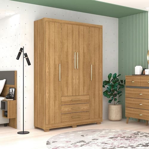 Dispõe três gavetas com profundidade excelente para acomodar todas as suas roupas, contando com quatro prateleiras perfeitas para guardar sapatos, cobertores
