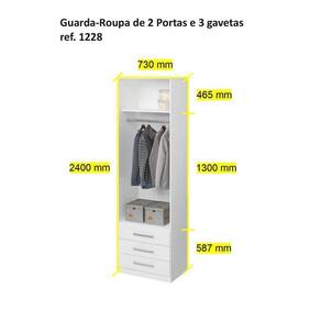 Guarda-roupa De 2 Portas 1228 Castanho * Imagens meramente ilustrativas. Guarda-roupas compacto de 2 portas com maleiro interno que dispõe de cabideiro, corrediças e dobradiças metálicas. Junte 2 ou mais armários e componha a gosto seu armário modulado com mais portas. - 02 portas; - Maleiro interno; - Cabideiro em alumínio; - 3 gavetas amplas; - Puxadores grandes cromados. DIMENSÕES DO PRODUTO MONTADO - ALTURA 240 CM; - LARGURA 73 CM; - PROFUNDIDADE 51CM Atenção: Não nos responsabilizamos, no ato da entrega, por desmontagens, subir escadas/elevadores ou transporte por guincho para apartamentos. Eventuais despesas são de responsabilidade do cliente. Confira as dimensões deste produto e certifique-se de que o mesmo passará normalmente por supostos elevadores, portas, escadas e/ou corredores de sua moradia.