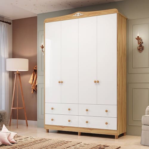 O guarda roupas infantil de estilo provençal apresenta uma estrutura resistente em 100% MDF com acabamento em Pintura UV atóxica, priorizando a segurança de toda família. Possui cabideiros metálicos, 4 gavetas com corrediças telescópicas para facilitar o acesso. Os pés e puxadores em plástico garantem durabilidade e facilidade de manutenção, enquanto seu design cria um ambiente elegante e funcional no quarto dos pequenos.
