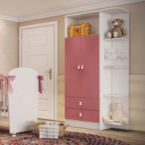 Guarda Roupa de Bebê 2 Portas 2 Gavetas com Cantoneira Baby Móveis Percasa Branco/Rosa. Guarda Roupa de Bebê 2 Portas em MDP BP branco 15 mm (nas laterais e prateleiras), acabamento laca (15mm) nas portas e frentes de gaveta. Gavetas com corrediça telescópica, dobradiças metálicas. Indicado para quarto de bebês. Ean: 7898519564112
