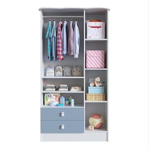 Guarda Roupa de Bebê 3 Portas 2 Gavetas Baby Móveis Percasa Branco/Azul. Guarda Roupa de Bebê 3 Portas 2 Gavetas em MDP BP branco 15 mm (nas laterais e prateleiras), acabamento laca nas portas e frentes de gaveta. Portas com dobradiças metálicas/Gavetas com corrediça telescópica. Ideal para uso em quarto infantil ou de bebê. Ean: 7898519564129