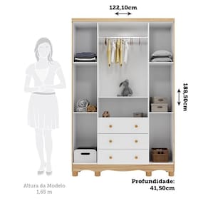 Guarda-Roupa de Bebê 4 Portas e 3 Gavetas 100% MDF Mimo Branco Brilho/Amêndoa. O Guarda Roupa Mimo foi desenvolvido para oferecer qualidade, beleza, conforto e segurança para toda família na hora de montar o quartinho do(a) bebê. É produzido com estrutura 100% MDF e acabamento em pintura UV atóxica. Possui 4 portas, 3 gavetas que deslizam sob corrediças metálicas telescópicas, 1 cabideiro metálico, 5 prateleiras para acomodar as peças com organização da sua preferência, puxadores e pés em plástico. Acompanham o produto, 2 opções de rodapés, um usinado (torneado) e outro reto, para que você escolha no momento da montagem qual se adequa ao estilo do ambiente. Aproveite para adquirir o seu agora!