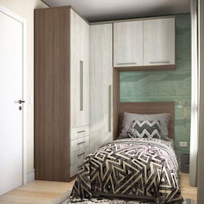A Linha Modulada Connect foi desenvolvida se adequando a vários espaços, de grandes a pequenos. Seus Roupeiros e Módulos com 236 cm de altura oferecem divisórias para atender diversas necessidades. Seus módulos com portas tem profundidade de 54cm possibilitando acomodar roupas sem amassar. Produzido em MDP de 15mm, dobradiças reforçadas em 35mm e corrediças telescópicas em todas as gavetas que possibilitam abertura total. Para esta proposta usamos as medidas de parede: Lado Cabeceira 190cm X 133cm.