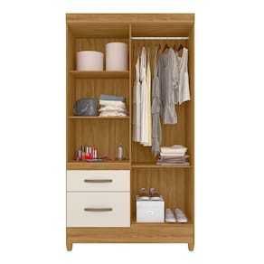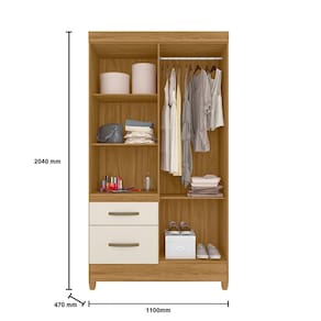 Guarda roupas solteiro Madri 4 portas com 2 gavetas, corrediças metálicas, interna com prateleiras e bastão cabideiro, espaço para acomodar sapatos, pés em PVC, puxadores plásticos na cor bronze, impressão UV.