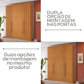 Características: - Estrutura em MDF de 12,15,25 mm - Puxadores em madeira - 04 Gavetas internas com corrediças telescópicas - 02 Portas ripadas e 02 portas lisas - Cabideiros em alumínio - Acabamento/Pintura: Semi-Brilho - Sem pés - Suporte de peso das prateleiras: 10 kg - Suporte de peso das gavetas: 5 kg - Suporte de peso dos cabideiros: 7 kg - Garantia de 3 meses