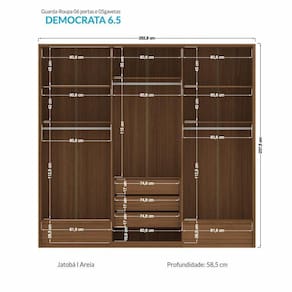 em semi fosco. Móvel fabricado de forma sustentável, preservando o meio ambiente.Opcional uso de espelhos. Acabamento da Prateleira: Pintura Escala de Brilho da Prateleira: Semi-Fosco Possui Cabideiros: 01 Acabamento da Gaveta: Pintura Escala de Brilho da Gaveta: Semi-Fosco Material do Puxador da Gaveta: MDP Possui Organizador de Gaveta: Não Acabamento da Porta: Pintura Escala de Brilho da Porta: Semi-Fosco Material do Puxador da Porta: MDF Ambiente Principal: Quarto codigo_ean: 7909903487532 Complexidade da Montagem: Alta: deve ser montado por um montador especializado Cor: Jatobá/Areia Cor do Produto: Jatobá/Areia Cor Flex: Não Cor Interna: Jatobá Escala de Brilho: Semi-Fosco Gaveta com Chave: Não Guarda-Roupa Suporta Até (kg): 20 kg Informações Complementares: Para garantir a qualidade do produto dentro da embalagem, as caixas são revestidas por um plástico termoencolhível e todas as peças externas são separadas por isomanta, tudo para preservar e evitar o atrito entre as peças dentro da embalagem. Você contará Itens Inclusos: 1 Guarda-Roupa, Kit Ferragens e Manual de Montagem Linha ou Coleção: Democrata Manual de Especificação Técnica: https://product-hub-prd.madeiramadeira.com.br/879667/documents/4405e85c-6b08-463b-a1f3-6b3eee4f61fe1663088163143.pdf Manual de Montagem e Instalação: https://product-hub-prd.madeiramadeira.com.br/879667/documents/9b5f4dbf-1c1f-46cc-843b-49dd29d184a382946023grdemocrata06pts11.pdf Material da Gaveta: MDF/MDP Material da Porta: MDF/MDP Material da Prateleira: MDP Material Principal: MDP modular: Não Montagem Flex: Não Necessita Montagem: Sim Origem do Produto: Nacional Peso: 199,2 kg Peso Máximo por Gaveta: 3 kg Peso Máximo por Prateleira: 3 kg Possui Calceiros: 02 Possui Espaço para Vestidos Longos: Não Possui Espelho: Não Possui Espelho Interno: Não Possui Ganchos: Não Possui iluminação: Não Possui Nichos: Não Possui Painel de TV: Não Possui Pés: Não Possui Portas: Sim Possui Prateleiras: Sim Possui Sapateira: Sim Produto Montado: Sim Quantidade de Gavetas: 05 Gavetas Quantidade de Prateleiras: 05 Prateleiras Recomendações de Uso, Manutenção e Limpeza: Não limpar com álcool ou qualquer outro produto químico, utilize somente pano seco ou levemente umedecido. Sistema de Montagem: Manual de montagem Suporta Até (kg): 20 kg Tipo de Corrediça da Gaveta: Metálica Telescópica Tipo de Dobradiça/Corrediça da Porta: Metálica Tipo de Gaveta: Interna e Externa Tipo de Guarda-Roupa: Casal Tipo de Puxador da Gaveta: Não Possui Tipo de Puxador da Porta: Externo Ean: 7909903487532