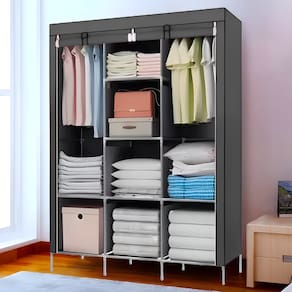 Armário prático de tecido dobrável com três divisões verticais, possui dois grandes espaços com cabideiro e 8 prateleiras. Possui cortina de rolo e abre e fecha com fechamento. Ele é projetado em tecido respirável de excelente qualidade e muito fácil de limpar. Também é fácil de montar. Uma opção útil e prática para manter suas roupas organizadas.