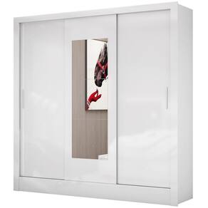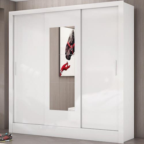 Guarda-roupa Dubai Com Espelho Branco Carioca Móveis Branco Guarda-Roupa Dubai combina 6 prateleiras, 1 cabideiro e 3 gavetas, alem de deixar o produto lindo e funcional, proporciona ao cliente acomodar suas roupas de forma organizada. As roldanas em aco e o trilho em aluminio potencializam o deslizar das portas. Cabideiro com 1,11m em aluminio. Ideal para pendurar pares de blusas, camisas, vestidos, acessorios, entre outros. As prateleiras e o lugar o ideal para colocar roupas de cama e de banho, perfumes, kits de maquiagem, caixinhas com acessorios e bolsas menores. As tres gavetas fixadas sobre corredicas metalicas, sao ideais para guardar pijamas, shorts, meias, roupas de academia e muito mais. As sapateiras tem o espaco ideal para guardar desde mala de viagem, ate colecoes de sapatos, tenis, ou outros acessorios. Caracteristicas: 3 Portas de Correr 1 Cabideiro 3 Gavetas 6 Prateleiras Espelho: Sim Material: MDP