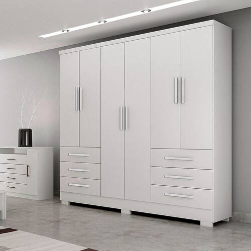 Guarda roupa Solteiro 6 portas 6 gavetas telescópicas Encanto - NOVO HORIZONTE Guarda Roupa Solteiro Encanto 6 Portas 6 Gavetas Telescópicas: organização e elegância para o seu quarto! O Guarda Roupa Solteiro Encanto 6 Portas 6 Gavetas Telescópicas da Novo Horizonte é a escolha ideal para quem busca um móvel completo, prático e funcional para organizar suas roupas e acessórios. Com design moderno e linhas retas, o Guarda Roupa Encanto se integra perfeitamente à sua decoração, proporcionando um visual organizado e sofisticado ao quarto. Detalhes que fazem a diferença: Espaço amplo: O guarda roupa possui 6 portas de bater e 6 gavetas com corrediças telescópicas, oferecendo amplo espaço para guardar roupas, calçados, acessórios e outros pertences.Organização: As gavetas com corrediças telescópicas facilitam o acesso aos seus pertences, permitindo que você visualize tudo o que está guardado.Cabideiros em alumínio: Os cabideiros em alumínio são mais resistentes e duráveis que os de madeira, além de serem mais fáceis de limpar.Acabamento em pintura UV: O acabamento em pintura UV de alta qualidade garante beleza e durabilidade ao guarda roupa, além de ser fácil de limpar.Qualidade Novo Horizonte: A Novo Horizonte é uma empresa renomada no mercado de móveis, reconhecida pela qualidade de seus produtos e pelo excelente atendimento ao cliente. Características: