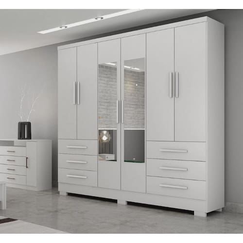Guarda roupa Solteiro 6 portas 6 gavetas telescópicas Encanto - NOVO HORIZONTE Guarda Roupa Solteiro Encanto 6 Portas 6 Gavetas Telescópicas: organização e elegância para o seu quarto! O Guarda Roupa Solteiro Encanto 6 Portas 6 Gavetas Telescópicas da Novo Horizonte é a escolha ideal para quem busca um móvel completo, prático e funcional para organizar suas roupas e acessórios. Com design moderno e linhas retas, o Guarda Roupa Encanto se integra perfeitamente à sua decoração, proporcionando um visual organizado e sofisticado ao quarto. Detalhes que fazem a diferença: Espaço amplo: O guarda roupa possui 6 portas de bater e 6 gavetas com corrediças telescópicas, oferecendo amplo espaço para guardar roupas, calçados, acessórios e outros pertences.Organização: As gavetas com corrediças telescópicas facilitam o acesso aos seus pertences, permitindo que você visualize tudo o que está guardado.Cabideiros em alumínio: Os cabideiros em alumínio são mais resistentes e duráveis que os de madeira, além de serem mais fáceis de limpar.Acabamento em pintura UV: O acabamento em pintura UV de alta qualidade garante beleza e durabilidade ao guarda roupa, além de ser fácil de limpar.Qualidade Novo Horizonte: A Novo Horizonte é uma empresa renomada no mercado de móveis, reconhecida pela qualidade de seus produtos e pelo excelente atendimento ao cliente. Características:
