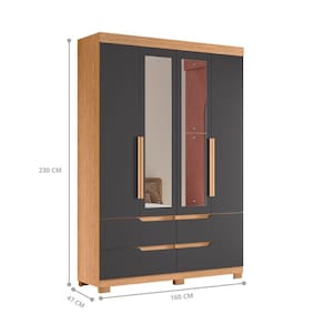 Feito em MDP.Possui detalhes nas portas laterais com acabamento ripado, 4 gavetas com corrediça telescópicas, 4 portas, 2 cabideiros e 10 prateleiras