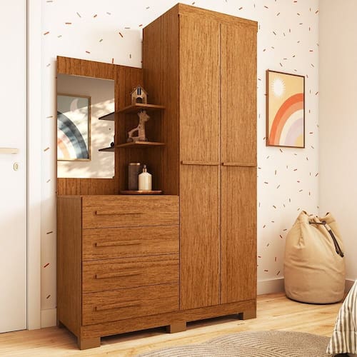 O Guarda Roupa 2 portas com cômoda Auris garante ao seu quarto mais beleza e praticidade ao seu dia-a-dia. Produzido em 100% MDF com excelente espaço interno, gavetas espaçosas com corrediças telescópicas metálicas, possui penteadeira com espelho, cabideiro em alumínio, possui pés que facilitam a limpeza abaixo do móvel. Acabamento da Prateleira: Pintura UV Escala de Brilho da Prateleira: Semi-Brilho Acabamento da Gaveta: Pintura UV Escala de Brilho da Gaveta: Semi-Brilho Possui Organizador de Gaveta: Não Acabamento da Porta: Pintura UV Escala de Brilho da Porta: Semi-Brilho Material do Puxador da Porta: MDF Acabamento dos Pés: Pintura Altura do Espelho: 60 cm Altura dos Pés: 5 cm Altura Máxima dos Pés: 5.0000 codigo_ean: 7900288191434 Complexidade da Montagem: Média: pode ser montado por mais de uma pessoa e/ou necessite de maior conhecimento para montagem Cor: Cinamomo Cor do Produto: Cinamomo Cor do Puxador: Marrom Cor Flex: Não Cor Interna: Branco Escala de Brilho: Semi-Brilho Espessura do Espelho: 3 mm Formato do Espelho: Retangular Gaveta com Chave: Não Guarda-Roupa Suporta Até (kg): 60 kg Itens Inclusos: 1 Guarda-Roupa com Cômoda, Kit Ferragens e Manual de Montagem Largura do Espelho: 35 cm Linha ou Coleção: Auris Manual de Montagem e Instalação: https://product-hub-prd.madeiramadeira.com.br/555246264/documents/fd6f008e-de3f-4043-8bde-84eb2e6ca8283057995453317520064117677.pdf Marca: Espresso Móveis Material da Gaveta: MDF Material da Porta: MDF Material da Prateleira: MDF Material dos Pés: ABS Material Principal: MDF modular: Não Montagem Flex: Não Necessita Montagem: Sim Nicho com Cabideiro: Não Origem do Produto: Nacional Peso: 58,8 kg Peso Máximo por Gaveta: 5 kg Peso Máximo por Prateleira: 5 kg Porta Janelada: Não Possui Calceiros: Não Possui Capelinha: Não Possui Ganchos: Não Possui Nichos: Não Possui Penteadeira: Sim Possui Pés: 06 Possui Portas: Sim Possui Prateleiras: Sim Produto Montado: Sim Quantidade de Cabideiros: 01 Cabideiro Quantidade de Espelho: 01 Quantidade de Gavetas: 04 Gavetas Quantidade de Prateleiras: 02 Prateleiras Recomendações de Uso, Manutenção e Limpeza: Para limpar não use nenhum tipo de produto, tais como sabão, esponja de aço, álcool e lustra-móveis. Use somente uma flanela seca. Não molhe nem exponha o móvel à umidade ou a luz solar diretamente ou outra forma de calor. Não encoste o móvel na parede. Não o arreste. Se precisar mudar o móvel de lugar, esvazie por completo o móvel, não o arraste, com ajuda de outras pessoas suspenda o móvel de forma segura e o posicione no lugar desejado. Sapatas Niveladoras: Não Sistema de Montagem: Parafusos, Minifix e Cavilhas Suporta Até (kg): 60 kg Tipo de Corrediça da Gaveta: Metálica Telescópica Tipo de Dobradiça/Corrediça da Porta: Metálica Tipo de Fixação do Espelho: Parafusos Tipo de Gaveta: Externa Tipo de Guarda-Roupa: Infantil Tipo de Puxador da Porta: Externo