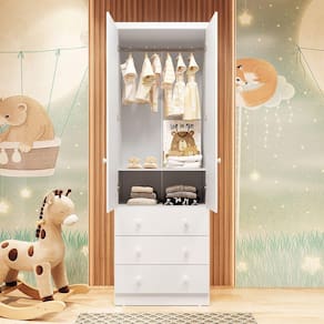 O Guarda Roupa Infantil Smim foi projetado para que mesmo em um pequeno espaço conseguir organizar todas as roupinhas do seu bebê. Contém 2 portas e 3 gavetas espaçosas com corrediças metálicas, puxadores em plástico e cabideiro metálico. Produzido em 100% MDF e acabamento em pintura UV atóxica, garantindo a melhor qualidade.