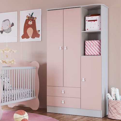 Guarda Roupa Infantil 3 Portas 2 gavetas Tedy Percasa O Guarda-Roupa 3 Portas e a opcao perfeita para quem busca funcionalidade, resistencia e um toque delicado na decoracao do quarto do bebe. Produzido em MDP BP, o movel oferece durabilidade e acabamento de alta qualidade, garantindo beleza no dia a dia. Conta com nichos abertos, ideais para acomodar itens decorativos ou de uso frequente, deixando tudo sempre a mao. Suas gavetas possuem corredicas telescopicas, que proporcionam abertura suave e total, enquanto as dobradicas metalicas garantem firmeza e longa vida util as portas. O destaque fica por conta do puxador em formato de urso, que adiciona um charme especial e combina perfeitamente com o ambiente infantil.