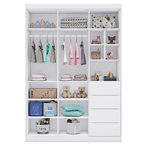Com este roupeiro, você vai contar com 3 portas, 4 gavetas com corrediças telescópicas que garantem um deslize suave e silencioso, cabideiro, puxadores em cava, prateleiras e nichos que permitem acomodar fraldas, toalhas, roupas e brinquedos. Além disso, é fabricado 100% em MDF com chapas de 12/15mm, revestimento com Pintura Uv atóxica, conferindo , durabilidade e resistência ao móvel.