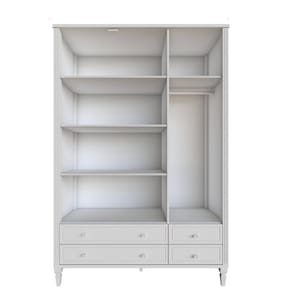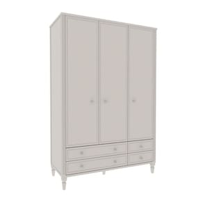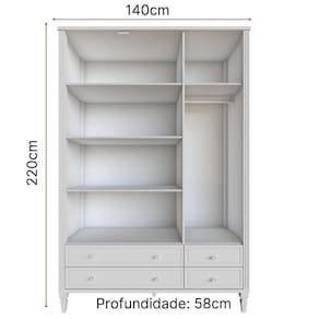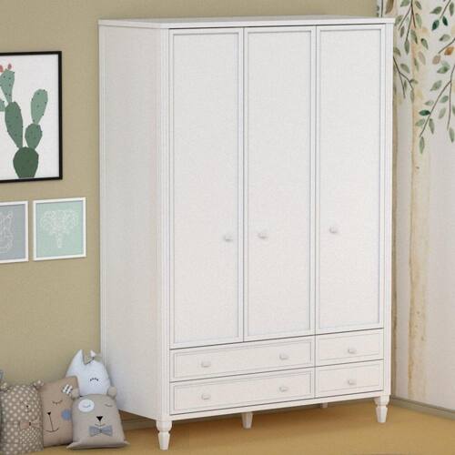 Guarda Roupa Infantil 3 Portas 4 Gavetas Tudor Timber Branco. Inspirada na solidez e tradição das famílias reais inglesas, a Linha Tudor traz o charme do estilo clássico, mas com uma pegada simplista. É a união perfeita da elegância com a leveza. O Roupeiro Tudor possui a estrutura reforçada, sendo utilizado em sua fabricação MDF de 2,5 cm de espessura, bem como mastros e pés em madeira maciça fresada. Essas características deixam o móvel muito robusto e durável. As gavetas recebem acabamento em palha talagarça. Puxadores resistentes e design clássico. A pintura laca traz o acabamento de alto padrão. Possui 5 prateleiras e um cabideiro interno, e 2 gavetas grandes e 2 pequenas externas. Disponível em 2 tamanhos: 1,40 e 1,60 mts. Marca: Timber Ean: 7908308749573