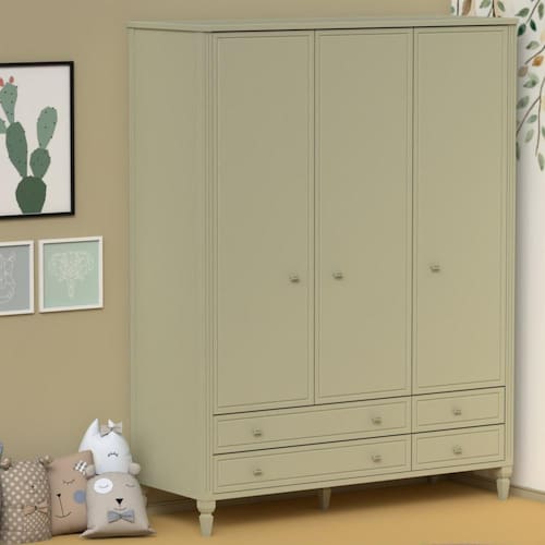 Guarda Roupa Infantil 3 Portas 4 Gavetas Tudor Timber Verde. Inspirada na solidez e tradição das famílias reais inglesas, a Linha Tudor traz o charme do estilo clássico, mas com uma pegada simplista. É a união perfeita da elegância com a leveza. O Roupeiro Tudor possui a estrutura reforçada, sendo utilizado em sua fabricação MDF de 2,5 cm de espessura, bem como mastros e pés em madeira maciça fresada. Essas características deixam o móvel muito robusto e durável. As gavetas recebem acabamento em palha talagarça. Puxadores resistentes e design clássico. A pintura laca traz o acabamento de alto padrão. Possui 5 prateleiras e um cabideiro interno, e 2 gavetas grandes e 2 pequenas externas. Disponível em 2 tamanhos: 1,40 e 1,60 mts. Marca: Timber Ean: 7908308749559