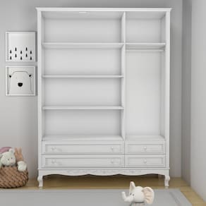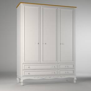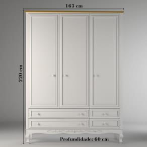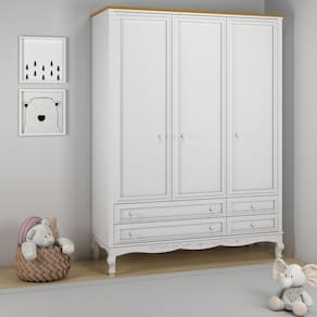 Guarda Roupa Infantil 3 Portas 4 Gavetas Versailles Timber Branco. Móveis clássicos, trazendo o estilo provençal com muita sofisticação. Com design charmoso e arabescos entalhados, os móveis da linha Versailles deixam o quarto digno da realeza. O guarda-roupa Versailles possui uma estrutura robusta e durável, pois utiliza em sua fabricação madeira maciça e MDF de 2,5cm de espessura. A sua base é reforçada, elevando o aspecto clássico e dando maior durabilidade. O acabamento de alto padrão traz: pintura laca, detalhes em alto relevo e arabescos entalhados. Puxadores de madeira maciça. Possui corrediças telescópicas largas, de alta resistência nas gavetas. E dobradiças soft close nas portas, com fechamento com amortecimento. Tem amplo espaço interno, com 5 prateleiras e 1 cabideiro. Disponível nas versões 1,40mt e 1,60mt. Marca: Timber Ean: 7908308793163