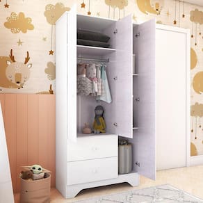 Guarda Roupa Infantil 3 Portas e 2 Gavetas 100% MDF Cocada Branco Brilho. A linha Cocada foi desenvolvida para oferecer qualidade, beleza, conforto e segurança para toda família na hora de montar o quartinho do(a) bebê. O guarda roupa é produzido com estrutura em MDF e acabamento em pintura UV atóxica. Possui 3 portas, 2 gavetas que deslizam sob corrediças telescópicas, puxadores em plástico, 1 cabideiro metálico que suporta até 5kg, tudo para acomodar as peças com organização da sua preferência . Acompanham o produto, 2 opções de rodapés, um usinado (torneado) e outro retrô, para que você escolha no momento da montagem qual se adequa ao estilo do ambiente. Aproveite para adquirir o seu agora! Ean: 7909903011324