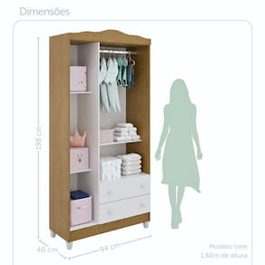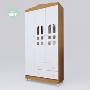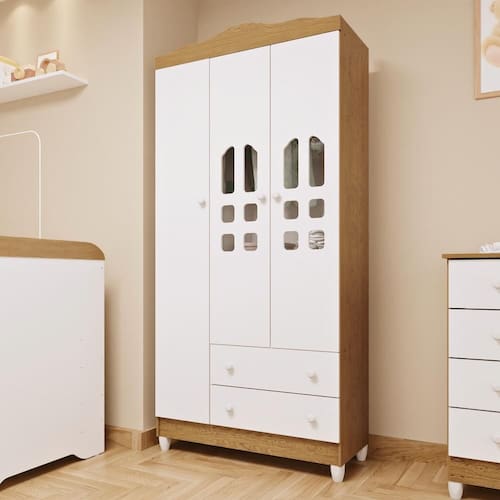 Mais que um guarda-roupa organizado, toda mamãe quer um móvel que dure. Nossas peças são fabricadas em 100% MDF de alta resistência mecânica. As gavetas ainda têm um sistema de travas em suas corrediças telescópicas. Este produto se encontra disponível nas cores Branco e Branco com Bétula.
