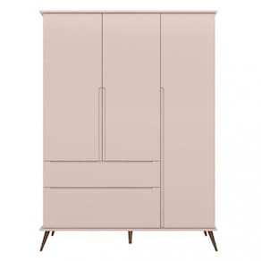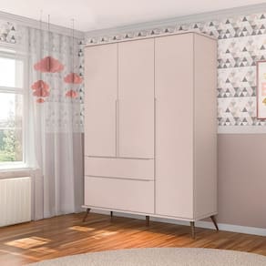 Guarda-Roupa Infantil Melinda é ideal para ambientes pequenos, com 3 portas e 2 gavetas espaçosas. Feito em MDF com acabamento em pintura UV atóxica e semi-brilho, tem pés de eucalipto e puxadores em cava. Perfeito para a decoração infantil e prático para uso diário.