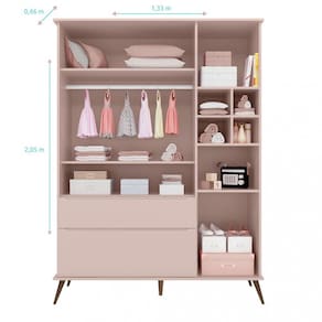 Características: Estrutura em MDF Acabamento em Pintura UV 3 Portas Dobradiças metálicas 2 Gavetas Corrediças telescópicas 4 Prateleiras 4 Nichos Cabideiro em alumínio 5 Pés em eucalipto