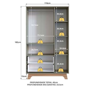 Com design clean e funcional, ele é produzido 100% em MDF 1,5cm, com fundos em 0,6cm e acabamento de alta qualidade. Conta com gavetas com corrediças telescópicas, tubo e suporte cabideiro em metal, e puxadores embutidos, que garantem segurança e um visual moderno.