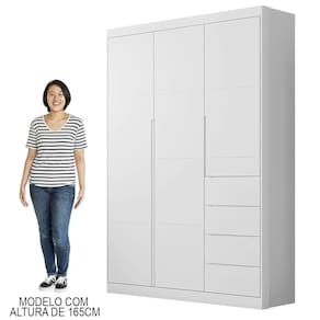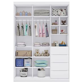 Com este roupeiro, você vai contar com 3 portas, 4 gavetas com corrediças telescópicas que garantem um deslize suave e silencioso, cabideiro, puxadores em cava, prateleiras e nichos que permitem acomodar fraldas, toalhas, roupas e brinquedos. Além disso, é fabricado 100% em MDF com chapas de 12/15mm, revestimento com Pintura Uv atóxica, conferindo , durabilidade e resistência ao móvel.