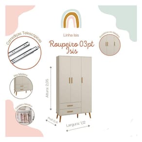Chegou a hora de comprar os móveis para o quartinho do bebê? Apresentamos o Guarda Roupa Infantil 3 Portas Isis desenvolvido pela Reller com estrutura em MDF, amplo espaço interno e design super moderno, perfeito para deixar o ambiente sofisticado, organizado e prático, aproveite!