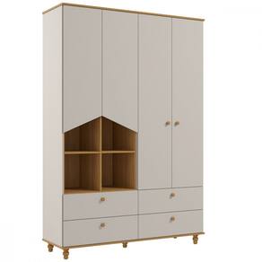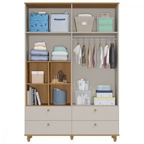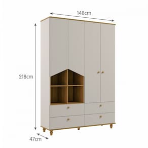 Seguindo o estilo lúdico, esse roupeiro é perfeito para quem deseja um móvel para organizar e, também, decorar. O detalhe fica por conta dos nichos laterais e as portas em formato casinha. Os nichos laterais podem ser utilizados para objetos decorativos, cestos para organização de brinquedos, livros e etc. Os espaços internos de prateleiras e maleiros são ideais para guardar desde objetos menores até objetos maiores como malas, pacotes de fraldas e caixas ou cestos de organização.