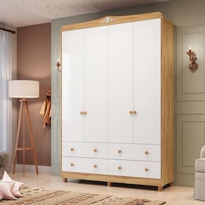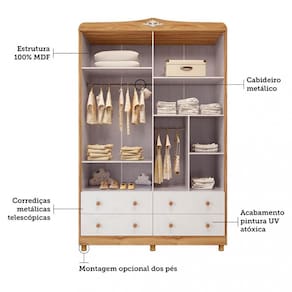Características: 2 Cabideiros metálicos 4 Gavetas 4 Portas 5 Prateleiras 6 Pés em plástico com regulagem Acabamento pintura UV atóxica Corrediças metálicas telescópicas Dobradiça metálica Estrutura 100 em MDF Produto Flex, pode ser montado com ou sem pés Suporta até 50kg ao total, sendo 5 por prateleira e 4 por gaveta Puxadores pontuais em plástico