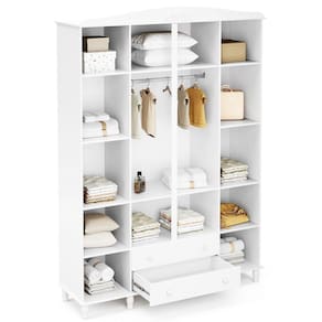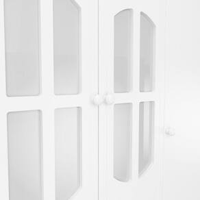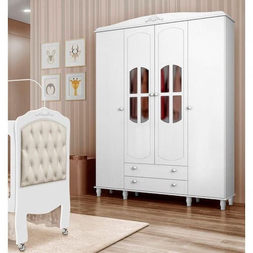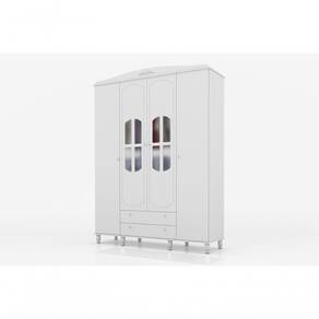 Roupeiro 04 portas produzido em MDF com pés de madeira maciça. Possui 2 gavetas com corrediças telescópcas. Também conta com puxadores em madeira, detalhe em acrílico na porta e detalhe de arabesco na parte superior, cabideiro em alumínio, dobradiças de 35mm e pintura atóxica. Amplo espaço interno com várias prateleiras.