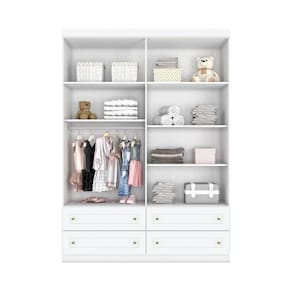 Guarda Roupa Infantil 4 Portas 4 Gavetas Mississipi Henn Branco HP. Produto inspirado na decoração escandinava, aconchegante e encantador, capaz de adequar o tradicional com o contemporâneo, excelente para modernizar seu ambiente, podendo ser utilizado para quartos adultos, juvenil e infantil. Possui medidas de 2.205mm de altura, 1.585mm de largura e 465mm de profundidade. Tanto nas portas quantas nas gavetas possuem desenhos de usinagem em baixo relevo, gavetas com corrediças telescópicas asseguram um fechamento suave e maior abertura das gavetas, puxadores ABS na cor bronze. Roupeiro elegante e sofisticado excelente para compor seu ambiente e proporcionando sutileza ao espaço.