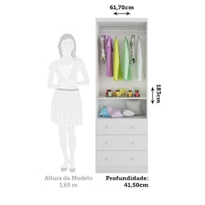 É produzido com estrutura 100% MDF e acabamento em pintura UV atóxica. Possui 2 portas, 3 gavetas que deslizam sob corrediças metálicas telescópicas, 1 cabideiro metálico, 1 prateleira para acomodar as peças com organização da sua preferência e puxadores em plástico. Acompanham o produto, 2 opções de rodapés, um usinado (torneado) e outro reto, para que você escolha no momento da montagem qual se adequa ao estilo do ambiente. Aproveite para adquirir o seu agora!! Acabamento da Prateleira: Pintura UV Escala de Brilho da Prateleira: Semi-Brilho Possui Cabideiros: Não Acabamento da Gaveta: Pintura UV Escala de Brilho da Gaveta: Brilhante Possui Organizador de Gaveta: Não Acabamento da Porta: Pintura UV Escala de Brilho da Porta: Brilhante Material do Puxador da Porta: MDF Ambiente Principal: Quarto Infantil codigo_ean: 7909903903483 Complexidade da Montagem: Média: pode ser montado por mais de uma pessoa e/ou necessite de maior conhecimento para montagem Cor: Branco Cor do Produto: Branco Cor Interna: Branco Escala de Brilho: Brilhante Gaveta com Chave: Não Guarda-Roupa Suporta Até (kg): 30 kg Informações Complementares: • 2 Portas com janela em PETG cristal/Acrílico. • Pintura atóxica. • 1 cabideiro metálico •Estrutura MDF 12mm. Fundo em HDF 2,5mm. Itens Inclusos: 1 Guarda Roupas, kit ferragens e manual de montagem Linha ou Coleção: Mimo Manual de Montagem e Instalação: https://product-hub-prd.madeiramadeira.com.br/937142/documents/58d5a2bd-32a2-461e-bbf1-123a344f00cd2275345281917249407386631.pdf Material da Gaveta: MDF Material da Porta: MDF Material da Prateleira: MDF Material Principal: MDF modular: Não Montagem Flex: Pode ser montado com rodapé usinado (torneado) ou reto. Necessita Montagem: Sim Origem do Produto: Nacional Peso: 37,24 kg Peso Máximo por Gaveta: 4 kg Peso Máximo por Prateleira: 5 kg Possui Calceiros: Não Possui Espelho: Não Possui Pés: Não Possui Portas: Sim Possui Prateleiras: Sim Produto Montado: Sim Quantidade de Gavetas: 03 Gavetas Quantidade de Prateleiras: 01 Prateleira Recomendações de Uso, Manutenção e Limpeza: Para limpeza utilizar somente pano limpo e macio, ligeiramente umedecido em água (apenas o bastante para remover a poeira), seguido de um pano seco. Sistema de Montagem: Parafusos autoatarraxantes, conjuntos minifix, cavilhas de madeira, acessórios plásticos e metálicos Suporta Até (kg): 30 kg Tipo de Corrediça da Gaveta: Metálica Telescópica Tipo de Dobradiça/Corrediça da Porta: Metálica Tipo de Gaveta: Externa Tipo de Guarda-Roupa: Bebê Tipo de Puxador da Porta: Externo