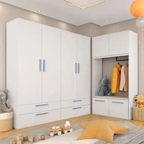 Guarda Roupa Modulado Infantil Joy com Puff Baú e 4 gavetas você tem o cantinho dos sonhos com organização!