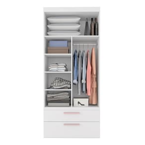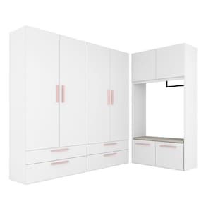Detalhes Técnicos: Medidas do Produto Montado: A:220cm x L:160cm x L:80cm x P:47cm Medida do Módulo 2pts 2gav: A:220cm x L:80cm x P:47cm Medida do Módulo 2pts: A:220cm x L:80cm x P:47cm Medida do Puff Baú: A:46cm x L:77cm x P:47cm MDP 15/25mm Acabamento:Pintura UV Tonalidade:Branco/Rosa/Linho Bege Puxadores:MDF 18mm Cabideiro interno:Alumínio Cabideiro Externo:Metalon em pintura Epóx preto Prateleiras suporta até 5kg distribuído Gavetas suporta até 3kg distribuído Puff Baú suporta até 80kg distribuído Assento do Puff removível no tecido Linho Bege